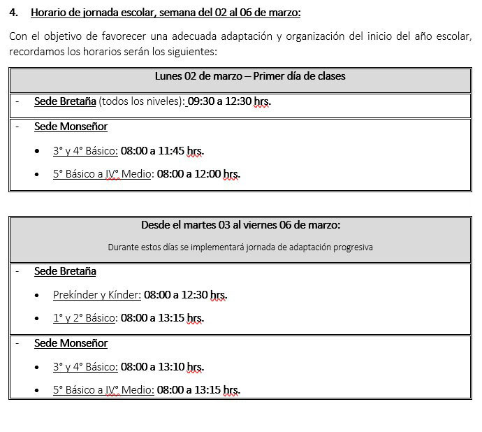 • Horario de jornada escolar, semana del 02 al 06 de marzo 2026